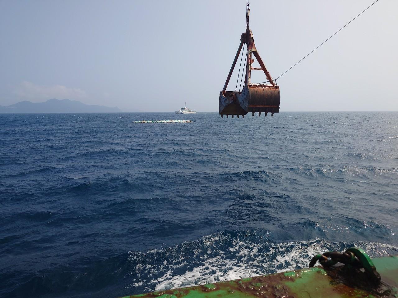 クレーン船による漂流物引き揚げの様子。