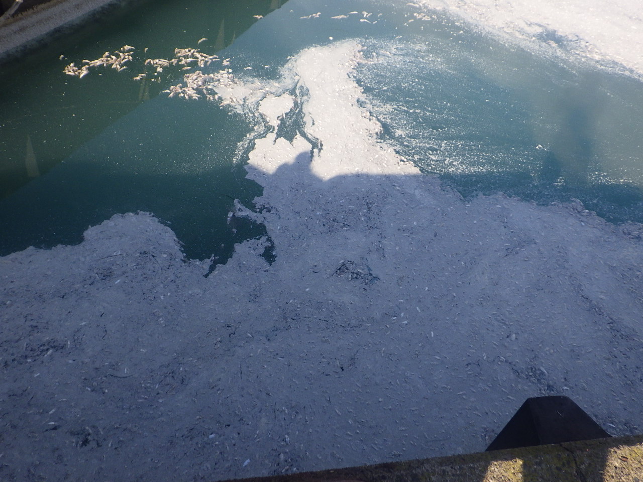 汚濁防止フェンスで死骸の拡散防止・集積後、回収を行った。